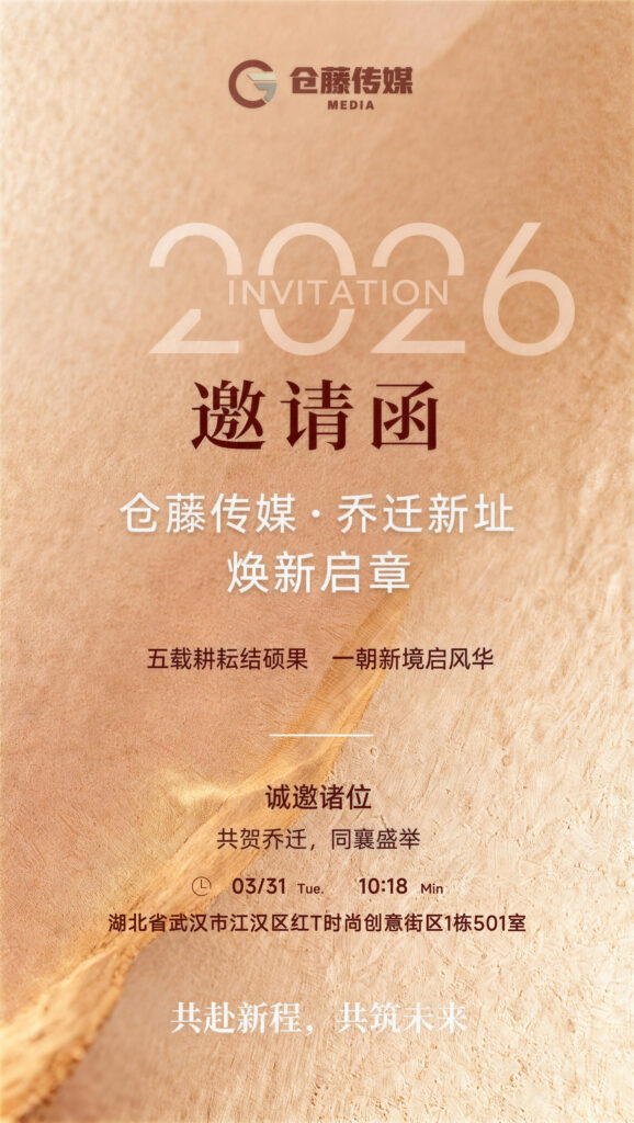 春启新程,万象更新。值此万物生长之际,武汉仓藤传媒有限公司迎来发展新里程碑 —— 公司正式乔迁新址,并定于2026 年 3 月 31 日 10:18举行乔迁启幕仪式,新址坐落于武汉市江汉区江汉经济开发区江旺路 8 号红 T 时尚创意街区 1 栋 501 室。五载耕耘结硕果,一朝新境启风华,仓藤传媒以全新坐标,开启生态共生、智造品牌的发展新篇。